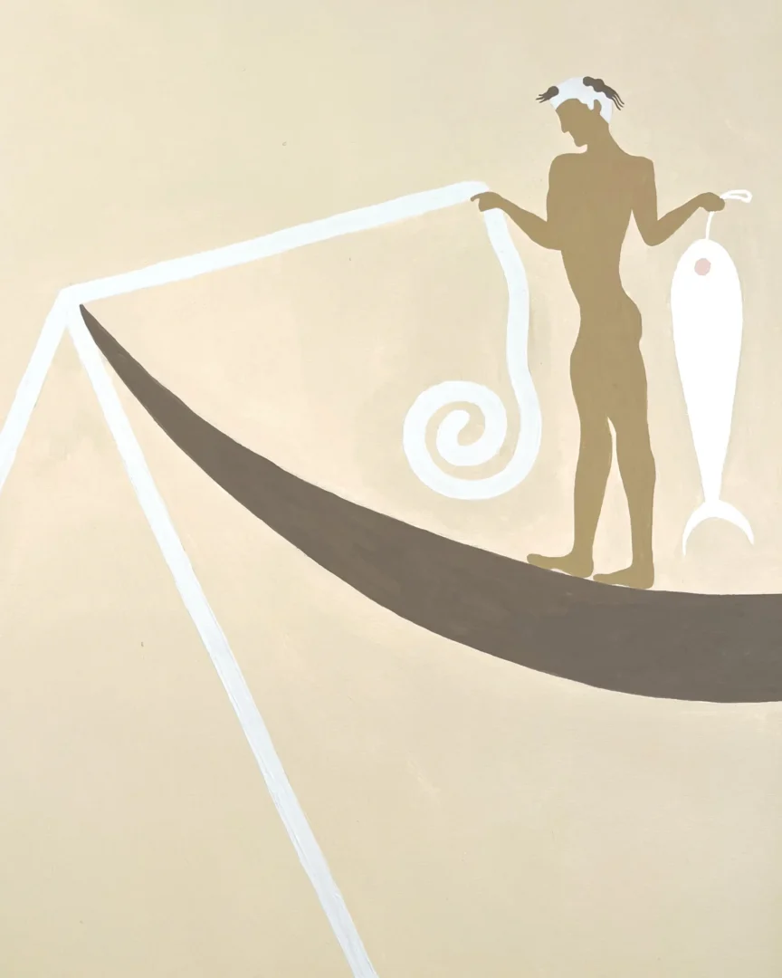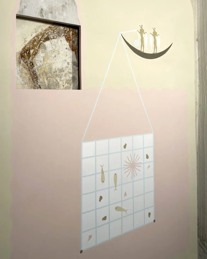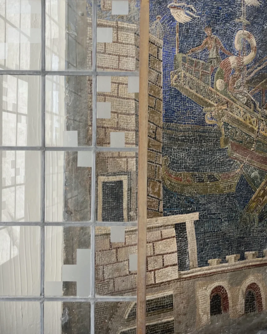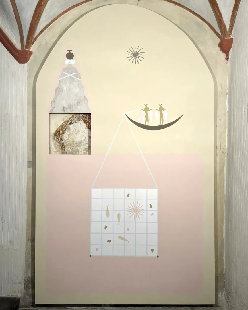 Il legame del Palazzo con il mare, espresso dagli apparati decorativi oltreché dalla presenza del Museo Navale Romano, rappresenta il fil rouge che connette le tre opere site-specific. Un tema caro e ampiamente indagato nella ricerca di Guerrilla Spam, che qui assume significati e sfaccettature differenti, in un climax concettuale e narrativo. “I pescatori” parla del mare come fonte di nutrimento e di vita, spazio di speranza per chi pesca così come per chi lo naviga in cerca di una nuova occasione; “I naviganti” ne mostra il lato più relazionale e di scambio, rivelando le connessioni che da secoli caratterizzano il Mediterraneo e i popoli che vi si affacciano; infine “I tuffatori” esplorano il mare come espressione di conoscenza, libertà e sguardo verso il futuro. Tematiche che emergono nel quotidiano, oggi più che mai.